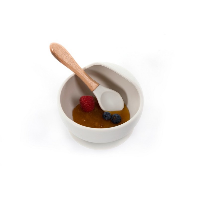Ce bol en silicone avec ventouse et sa cuillère assortie (bois et silicone) va permettre à bébé d’apprendre à manger seul, grâce à son bord incurvé, sans l’aide papa ou maman !