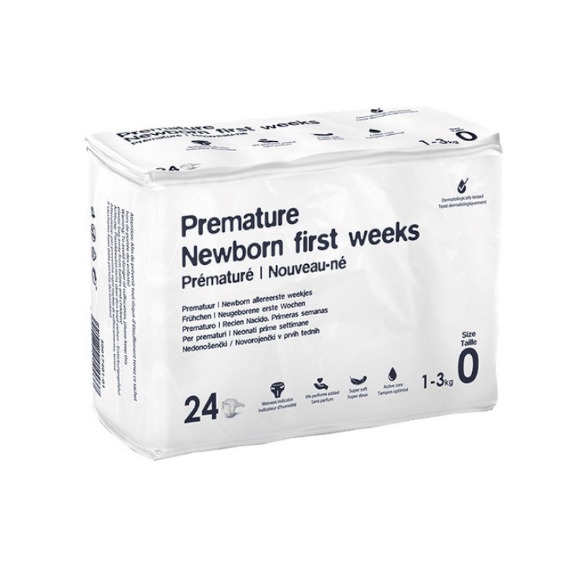 Les tailles prématuré, T1 new born, et T6 sont conditionnées en sachet.
