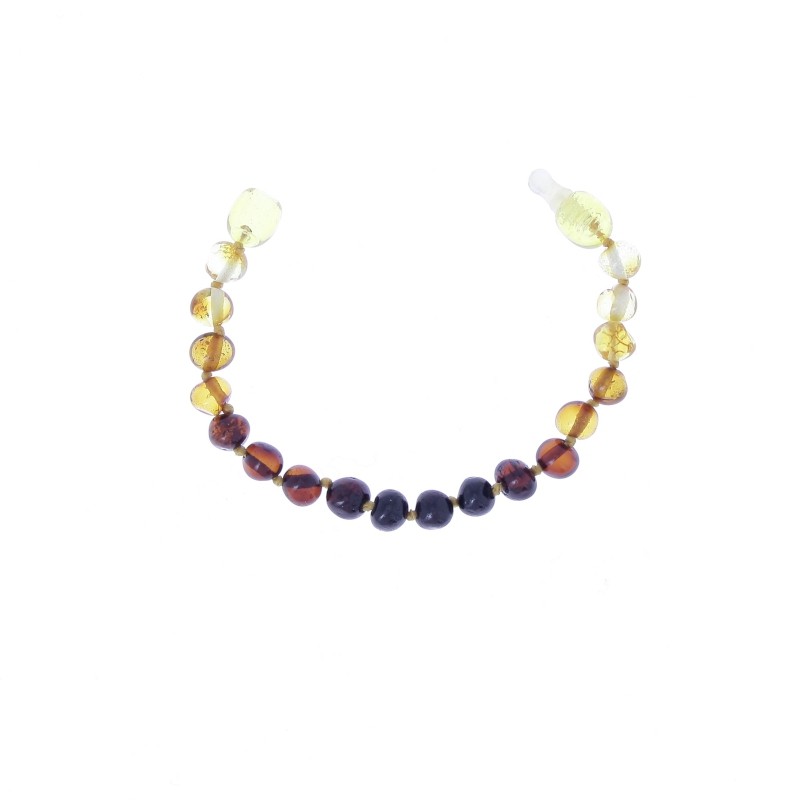 Bracelet bébé de billes d´ambre véritable de la Mer Baltique qui a la réputation d´adoucir la douleur provoquée par les poussées dentaires et d’aider à combattre les maladies et le stress.