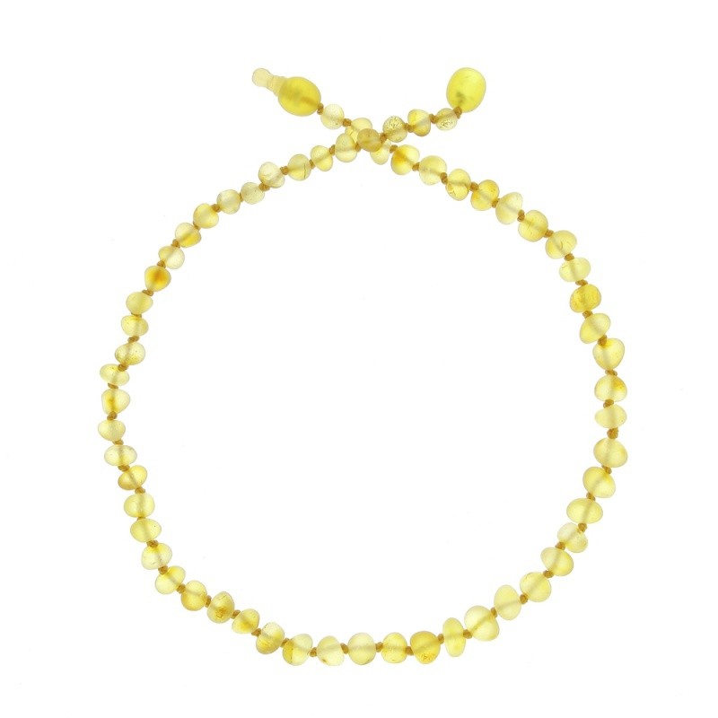 Collier bébé de billes d´ambre véritable de la Mer Baltique qui a la réputation d´adoucir la douleur provoquée par les poussées dentaires et d’aider à combattre les maladies et le stress.