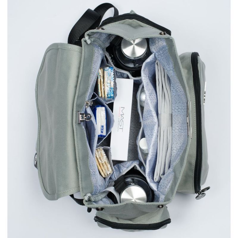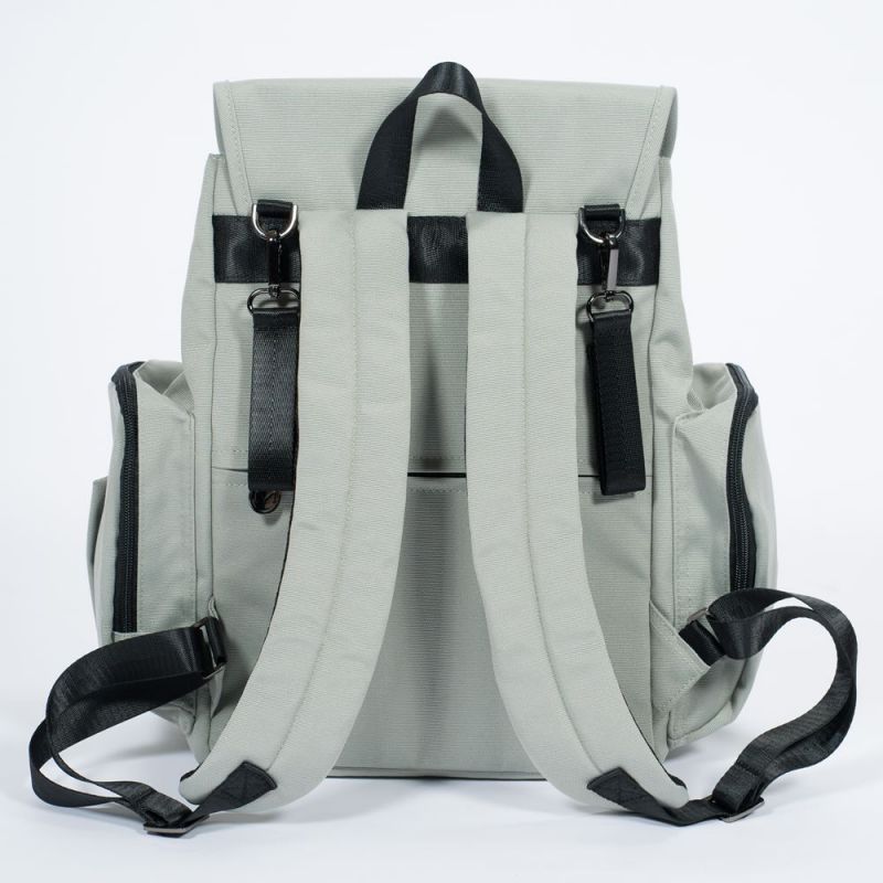Le sac à dos à langer classy est doté d'une poche arrière avec une fermeture pour vos objets personnels et deux pochettes latérales avec une fermeture (l'une d'entre elle a été conçue pour conserver les lingettes humides). Un matelas à langer de voyage se trouve dans une grande poche rembourrée.