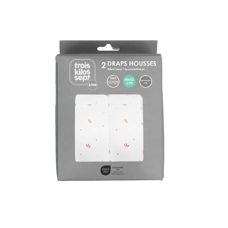 Lot de 2 draps-housse pour berceau de bébé parfait pour assurer le confort de votre enfant. Présentés sous boîte, ces draps-housse sont de couleur écrue, ornés de motifs pétales couleur caramel, ajoutant une touche élégante et douce à la chambre de votre bébé.
